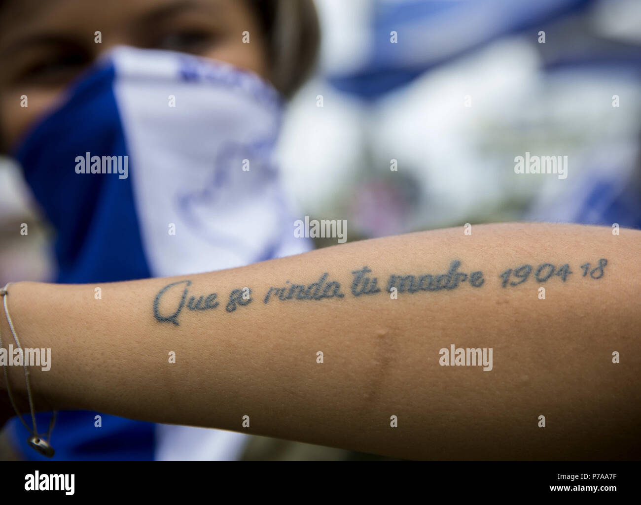 Managua Nicaragua 04th July 18 A Young Woman Shows A Tattoo Alluding To The Protests During A Sit In Called Human Chain From Rotunda To Rotunda At A Distance Of 3 4 Km On