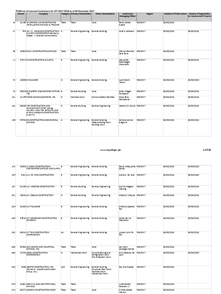 Pcab List Of Licensed Contractors For Cfy 17 18 As Of 04 Dec 17 Web Engineering Nature