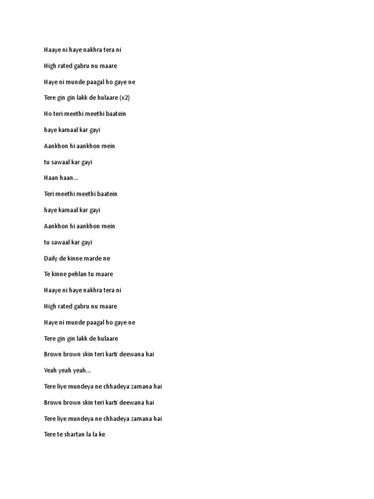 Haye ni haye nakhra tera ni high rated gabru nu maare haye ni munde pagal ho gaye ne tere gin gin lakk de hulaare haye ni haye nakhra tera ni high rated gabru nu maare haye ni munde pagal ho gaye ne tere gin gin lakk de hulaare ho teri meethi meethi baatein haye kamaal kar gayi aankhon hi aankhon mein tu sawaal kar gayi haan haan. About Press Copyright Contact us Creators Advertise Developers Terms Privacy Policy & Safety How YouTube works Test new features Press Copyright Contact us Creators. Haaye ni haaye nakhra tera ni High rated gabru nu maare Haaye ni munde paagal ho gaye ne Tere gin gin lakk de hulaare (Hun ye nakhra) Nakk vich paaya koka Kehar kamaunda aa Hath vich paaya chooda.
