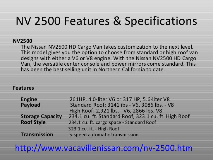 Specs & Features Safety with the cargo model further broken into 1500 and the heavierduty 2500 and 3500 models that can handle more payload The Nissan NV cargo van’s payload ranges. The table below shows all 14 Nissan NV Cargo NV2500 HD specs by style, including MPG (fuel economy), transmission details, and interior and exterior dimensions Additionally, find 14 Nissan NV Cargo NV2500 HD warranty and reliability information, such as limits on bumpertobumper coverage and major components. New 21 Nissan NV Cargo NV2500 HD from Charlie's Nissan in Augusta, ME, Call (8) for more information.