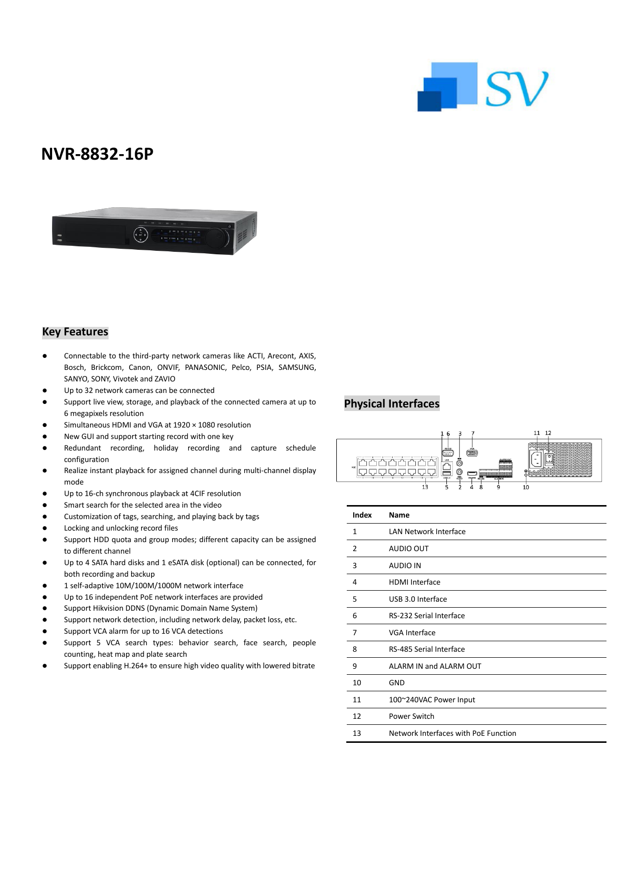 DS7608NIE2/8P / DS7616NIE2/16P REAR VIEW 1 Power Supply Port 2 Audio In 3 HDMI Monitor Output 4 Network Interface(RJ45) 5 Audio Out 6 VGA Output 7 USB Port 8 Grounding Screw 9 Power Switch 10 Built in POE Switch 11 Alarm In/Out FRONT VIEW 1 Power, Status and Tx/Rx indicators 2 USB Port. DS7616NIE2/16P DS7604NIE1/4P DS7600NIE Series Plug and Play Network Video Recorder DS7608NIE2/8P DS7616NIE2/16P 100 to 240 VAC, PoE (8023at) 16 independent 100 Mbps PoE network interfaces 0 W ≤15 W Part No DS7616NIE2/16P Video Compression H264, H264. View a manual of the Hikvision DS7732NIE4/16P below All manuals on ManualsCatcom can be viewed completely free of charge By using the 'Select a language' button, you can choose the language of the manual you want to view.
