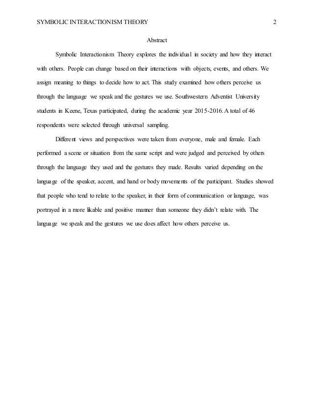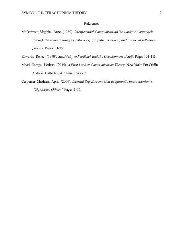 For this assignment, you will use what you’ve learned about symbolic interactionism to develop your own analysis Your assignment is to select a television program that you know contains social inequality or social class themes In 35 pages make sure to provide the following. Excerpt from Term Paper Theoretical Treatments of Symbolic Interactionism In order to develop a deeper understanding of sociological theories designed to describe the complexities of the cognitive process, it is essential to identify tangible examples of these as they are manifested in the real worldThe concept of symbolic interactionism, while carrying varying connotations depending on the. The symbolic interactionism perspective, however, adopts the concept that the society is a result of the daily interactions between individuals in the society Structural functional and symbolic interaction are sociological paradigms that may help to analyze the crime case above From Structural functionalism view, the crime is justified as.