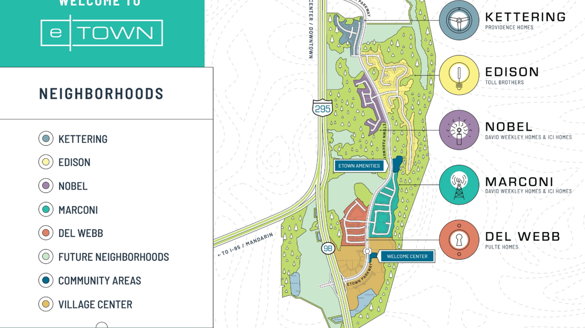 ETown is a new community focused on Convenience, Technology & Sustainability in the heart of Jacksonville, Florida PARC Group Development. Find the perfect home with Toll Brothers View Toll Brothers' new homes for sale in Jacksonville, FL, and choose from a variety of home designs & floorplans. For more information about Del Webb Etown properties for sale, including previous pricing history, property disclosures and more, or to arrange a home showing,.
