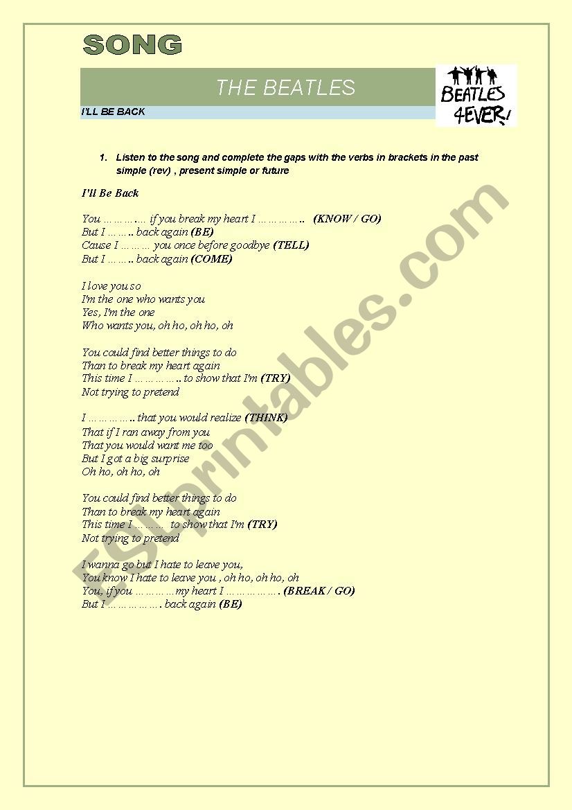 I Ll Be Back By The Beatles Esl Worksheet By Ring A