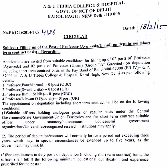 Vacancy For The Post Of Professor Ayurveda Unani Ayurvedic And Unani Tibbia College Delhi