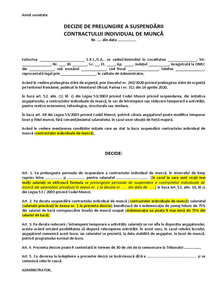 Decizie De Prelungire A Suspendării Contractului Individual De Muncă