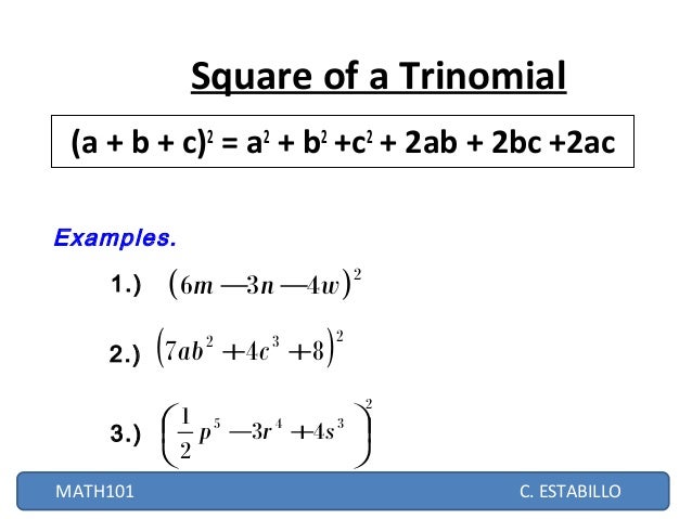 A 2 b 2 c 2 118 – 118 = 625 – 118 subtracting 118 from both the sides Therefore, a 2 b 2 c 2 = 507 Thus, the formula of square of a trinomial will help us to expand. Get the list of basic algebra formulas in Maths at BYJU'S Stay tuned with BYJU'S to get all the important formulas in various chapters like trigonometry, probability and so on. A 2 b 2 = c 2 Example The smallest Pythagorean Triple is 3, 4 and 5 Let's check it 3 2 4 2 = 5 2 Calculating this becomes 9 16 = 25 Yes, it is a Pythagorean Triple!.