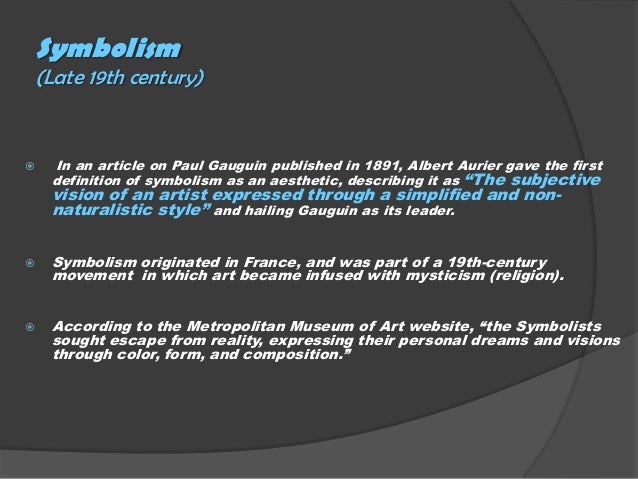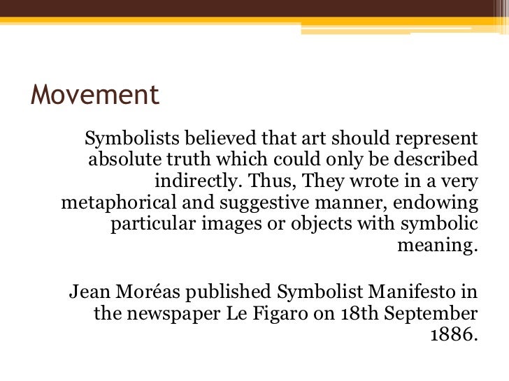 Symbolism was a late nineteenthcentury art movement of French, Russian and Belgian origin in poetry and other arts seeking to represent absolute truths symbolically through metaphorical images and language mainly as a reaction against naturalism and realism. Symbolism was a late nineteenthcentury art movement of French, Russian and Belgian origin in poetry and other arts seeking to represent absolute truths symbolically through metaphorical images and language mainly as a reaction against naturalism and realism. Art Movements are simply a historical convenience for grouping together artists of a certain period or style so that they may be understood within a specific context Art Movements are usually named retrospectively by art critics or historians and their titles are often witty or sarcastic nicknames pulled from a bad review.