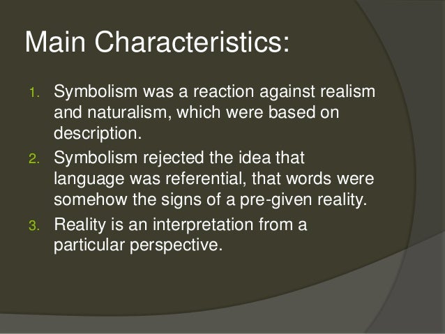 What are the characteristics of Symbolism?. Symbolism is an art of the dream, with the idea of the dream referring to alternative visions of reality Just as the dream does not represent something else but is an alternative vision, the symbolist painting is not thought of as a representation but as an embodiment of an alternative reality. Department of European Paintings, The Metropolitan Museum of Art August 07 Symbolism initially developed as a French literary movement in the 10s, gaining popular credence with the publication in 16 of Jean Moréas’ manifesto in Le Figaro Reacting against the rationalism and materialism that had come to dominate Western European culture, Moréas proclaimed the validity of pure subjectivity and the expression of an idea over a realistic description of the natural world.