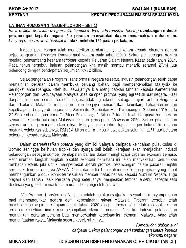 PENULISAN RUMUSAN FORMAT BARU SPM BERMULA TAHUN 21 BAHAN 1 Baca petikan dan teliti bahan grafik buat satu rumusan yang panjangnya yang disertakan di bawah, kemudian tidak melebihi 1 patah perkataan Anda digalakkan supaya menggunakan ayat anda sendiri tanpa mengubah maksud asal petikan. Soalansoalan contoh bagi subjek Bahasa Melayu Kertas 1 (1103/1), Bahasa Melayu Kertas 2 (1103/2), Bahasa Melayu Kertas 3 (1103/3) dan Bahasa Melayu Kertas 4 (1103/4) untuk SPM mulai tahun 21 boleh didapati di dalam buku format pentaksiran yang diterbitkan oleh Lembaga Peperiksaan, Kementerian Pendidikan Malaysia. Contoh Soalan Rumusan Spm Bahasa Melayu Meteran L via meteranlblogspotcom Contoh Soalan Karangan Bahasa Melayu Indeday E via indedayeblogspotcom Kerja Kursus Pendidikan Seni Visual (psv) Spm 16 (2611/3 via wwwbumigemilangcom Contoh Soalan Novel Tingkatan 4 Jendela Menghadap Jalan via persoalanvblogspotcom.