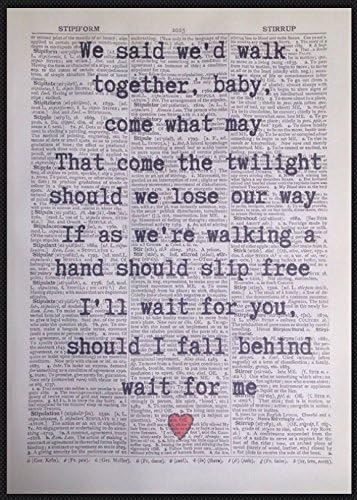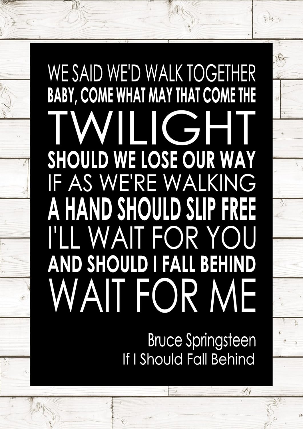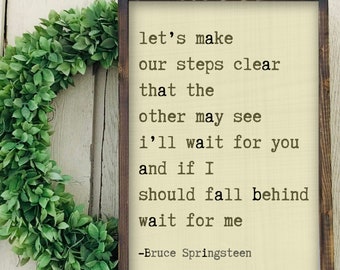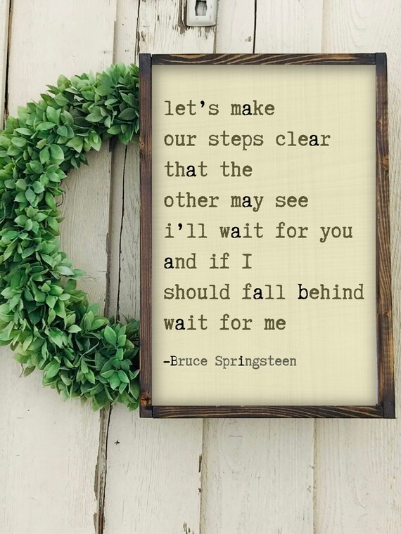 We said we'd walk together baby come what may That come the twilight should we lose our way If as we're walkin a hand should slip free I'll wait for you And should I fall behind Wait for me We swore we'd travel darlin' side by side We'd help each other stay in stride But each lover's steps fall so differently But I'll wait for you And if I should fall behind Wait for me Now everyone dreams of. Bruce Springsteen Lyrics Farmhouse Sign Anniversary Gift for Her I'll Wait For You Wait For Me Lyrics Sign Personalized Wedding Sign RELOVEDLUMBER From shop RELOVEDLUMBER 5 out of 5 stars (7,176) 7,176 reviews $ 5499 FREE shipping Only 3 available and it's in 3 people's carts. And I'll wait for you, and if I should fall behind wait for me Now there's a beautiful river in the valley ahead There 'neath the oak's bough soon we will be wed.
