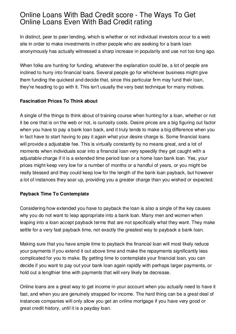 Of course, a peertopeer loan might not feature the lowest interest rate for your circumstances In fact, if you're a high lending risk, you might end up on the upper end of the scale, with APR. Loans for Bad Credit Check Rate With No Credit Risk Loans from $1,000 up to $40,000 Instant Online Application Check Loan Rates P2P Credit offers personal loan access to borrowers with bad credit Traditional banks often deny loan applications from borrowers with credit scores less than 680 However, with peer to peer lending, you are likely still eligible to get a loan with a fair interest rate – even if you have bad credit. PeertoPeer Lending Peertopeer lending is a new form of borrowing However, it works for individuals with bad credit or no credit history It was invented in 05 and has been used ever since A bad credit payday loan may be a quick and easy way to get your bank account back in the black The internet has really changed the game as far.