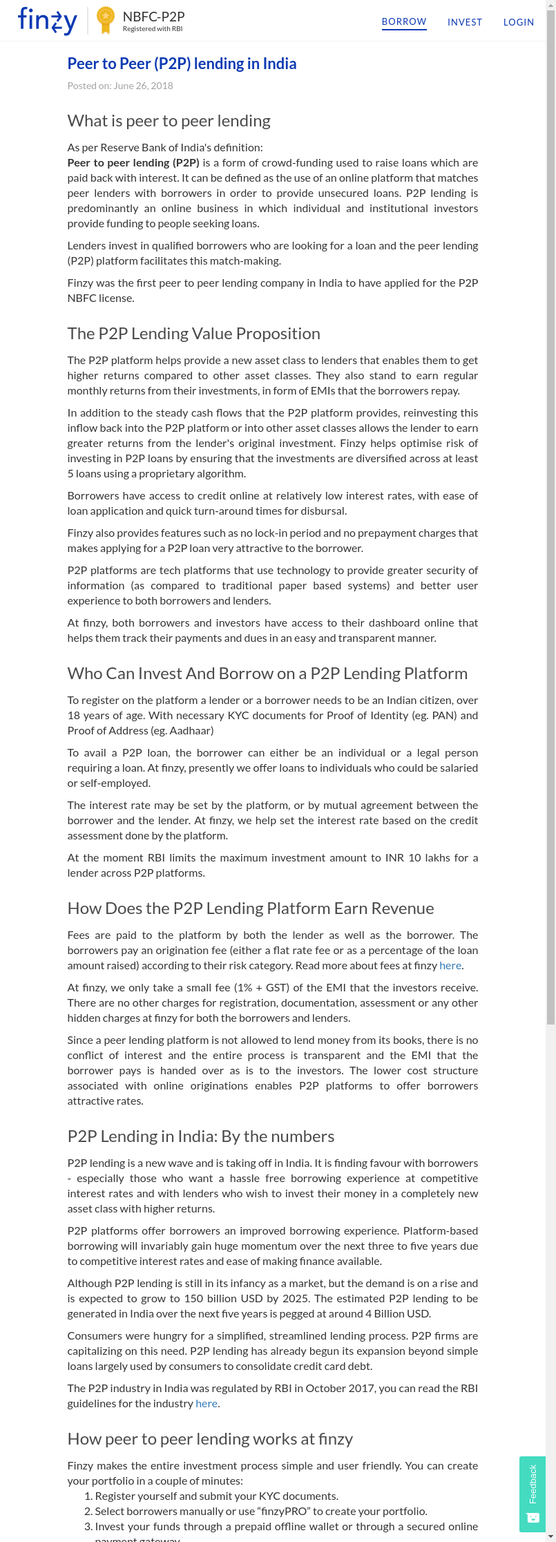 Peertopeer (P2P) lending is an empowering breakthrough in finance space to simplify the process to give and take unsecured personal loans As per directives from Reserve Bank of India, borrowers are assessed and verified before being listed on IndiaMoneyMart platform to become eligible for loans from the registered lenders. What is peer to peer lending?. I2iFunding is the best and most trusted peer to peer lending platform in India, it started operation in Oct 15 Peer to Peer lending (P2P lending) connects investors who lend money online with verified borrowers who are seeking to get affordable Peer to Peer (P2P) Loans i2iFunding is a Reserve Bank of India (RBI) registered NonBanking Financial Company – P2P Lending Platform (NBFCP2P).