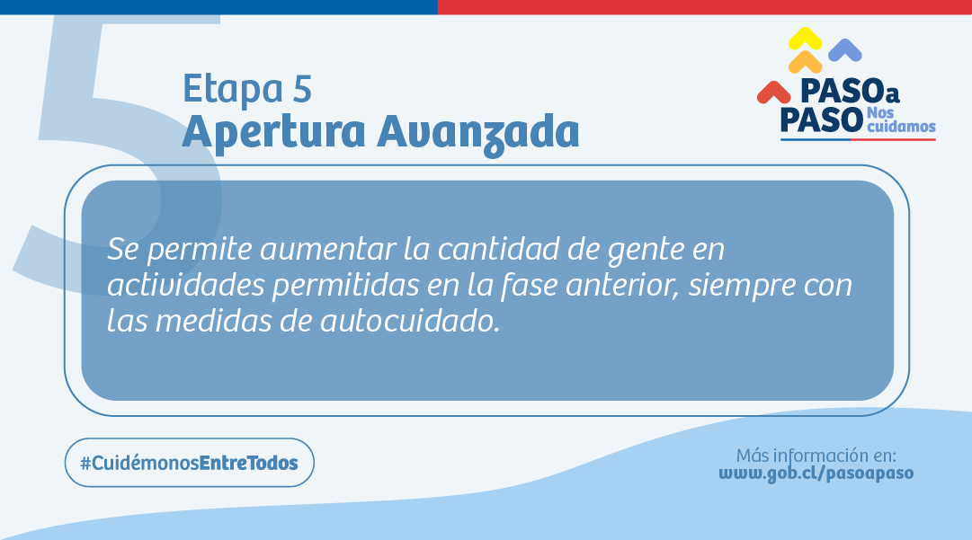 El Plan consta de cinco etapas 1) cuarentena, 2) transición, 3) preparación, 4) apertura inicial y 5) apertura avanzada En el caso de La Araucanía, la Región se encuentra en fase tres, es decir, en preparación para un eventual desconfinamiento (paso 4) como en estos momentos ocurre en la región de Los Ríos y Aysén. El Plan Paso a Paso cambiará sus reglas a partir del jueves, a las 0500 horasLas cuarentenas ahora tendrán un máximo de duración de cuatro semanas, y habrá restricciones de Permisos Únicos Colectivos El Gobierno endureció medidas frente al aumento de los contagios de Covid19 Así, de 18 comunas con habitantes se pasará a 42, con residentes, en cuarentena a. Este mediodía (15 de febrero), el Ministerio de Salud dio a conocer las modificaciones por comuna en el plan Paso a Paso En dicho contexto, la capital chilena de Tierra del Fuego, Porvenir avanza a Fase 3 Con la nueva disposicion, a contar del próximo jueves, desde las 5 de la madrugada, los porvenireños podrán salir todos los días de la semana, pero no a una comuna en cuarentena Deben.