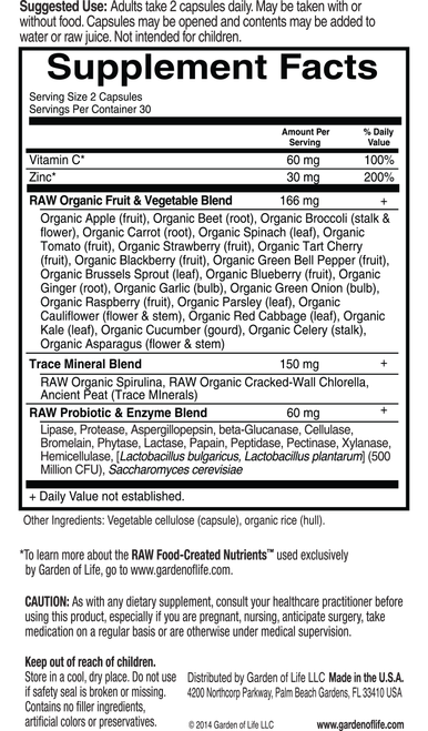 Description From Manufacturer's Label Garden of Life Vitamin Code® RAW Zinc is whole food nutrition, specifically formulated to provide 30mg and 273% of the Daily Value for Zinc plus 60mg of Vitamin C 23 powdered organically grown fruits and vegetables, plus 75 alkalizing trace minerals, add supporting antioxidants, vitamins and nutrient cofactors. High potency Raw Zinc supplies 30 mg, or 0% of the daily value for zinc, as well as 100% of the daily value for vitamin C It also features a blend of 17 raw, organically grown vegetables, 75 soilbased alkalizing trace minerals, and a probiotic and enzyme blend for optimal digestion. Made with individually grown nutrients cultivated with probiotics, Vitamin Code Raw Zinc is formulated with 30mg of highpotency, wholefood zinc, plus vitamin C And it's raw—no fillers, artificial flavors, sweeteners, or additives SKU.