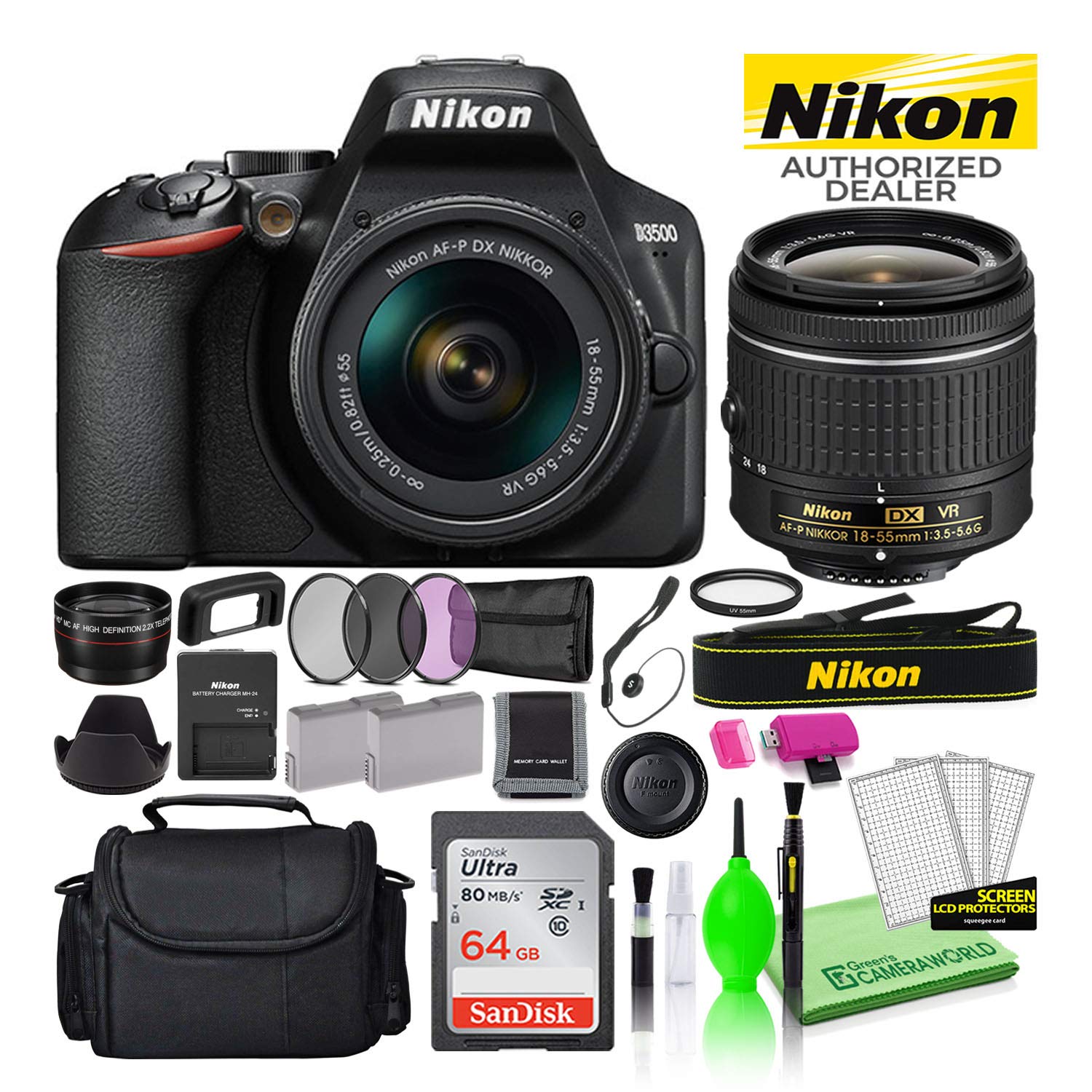 Nikon D3500 Dslr Camera With Af P Dx Nikkor 18 55mm F 3 5 5 6g Vr Lens Dslr Camera Case 32gb Memory Bundle 24pcs Priparax Com