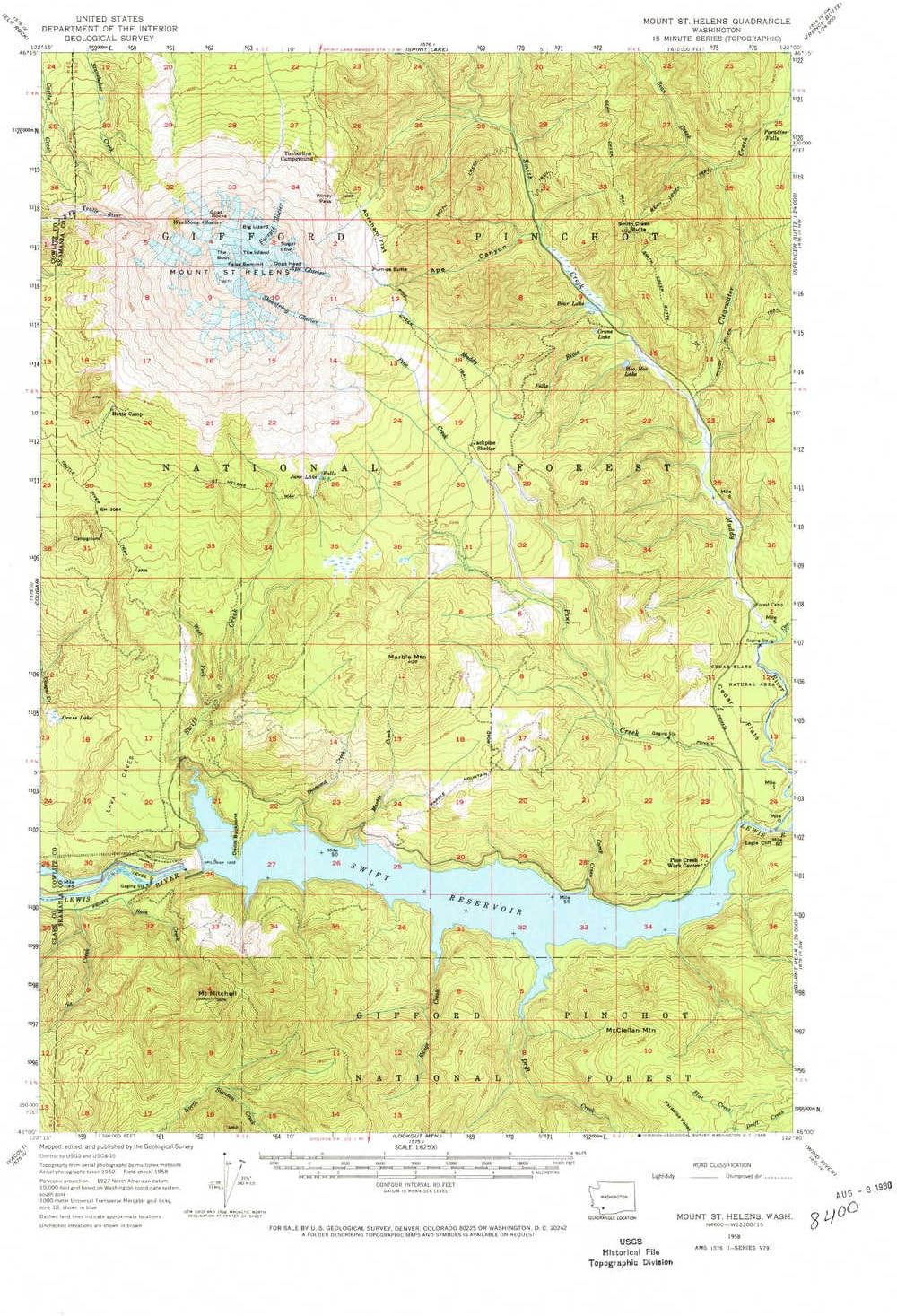 Topographic map of Mount St Helens, Washington, showing changes between April 11 and May 16, 1980 IMAP 1411 By Raymond Jordan and H H Kieffer. US Geological Survey OpenFile Report version 10 Geologic Map of Mount St Helens, Washington Prior to the 1980 Eruption By Clifford A Hopson 08 Oblique aerial view of Mount St Helens before the May 18, 1980, eruption, as seen from Bear Cove, Spirit Lake. Mount St Helens is an active volcano in Washington's Cascade Range Neighboring peak Mount Adams is the second highest summit in Washington after Mount Ranier Explore the beauty and geological wonder of these magnificent mountains with National Geographic's Trails Illustrated map of Mount St Helens, Mount Adams.