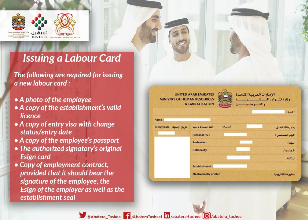 Ministry Of Labour Company Labour card Original ESignature card In case that the applicant does not have a personal number at the Ministry, an application for opening a UAE national’s or expatriate’s file, to apply the electronic signature card in Service Centers "Tasheel" It is then activated in the ministry E Signature Card 603 AED. Ministry of Human Resources & Emiratisation Use keywords that are as specific as possible For example, if you want to search about a service, use the “word service” not “a services” “and services” etc. Copy of passport, visa and EID of both the employee and their sponsor/spouse;.