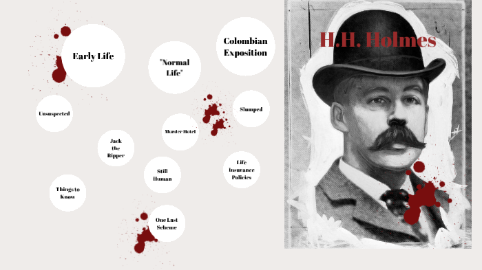 H H Holmes first came to Chicago in 16, leaving behind more than one previous life Born Herman Webster Mudgett, previous scandals gave him good reason to change his name Like in college, when he worked in the anatomy lab and mutilated cadavers to defraud life insurance companies. H H Holmes As a child, Holmes was very smart and acted like an adult Holmes was bullied during elementary school and forced into a pharmacy to look at a skeleton This may have started his curiosity about death By 11, Holmes would find animals and disable them without killing them (Bio). Having run in’s with bullies who forced him to face death by making him touch a skeleton Holmes appeared to very intelligent at.