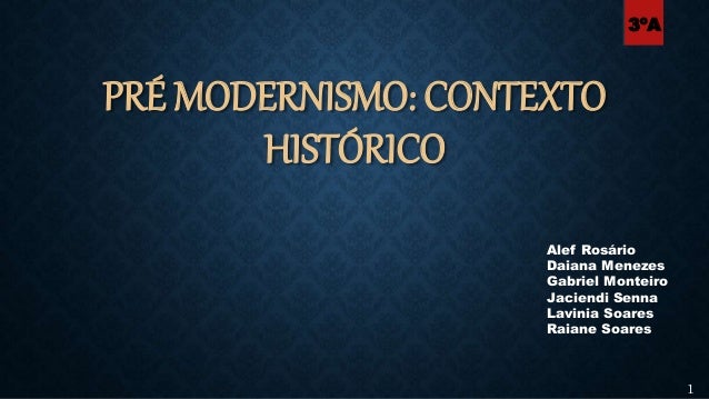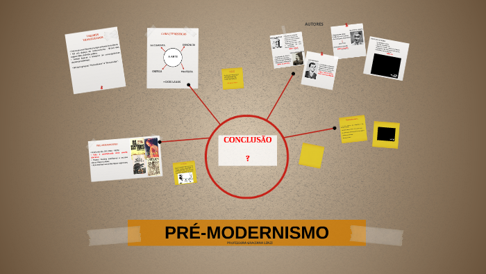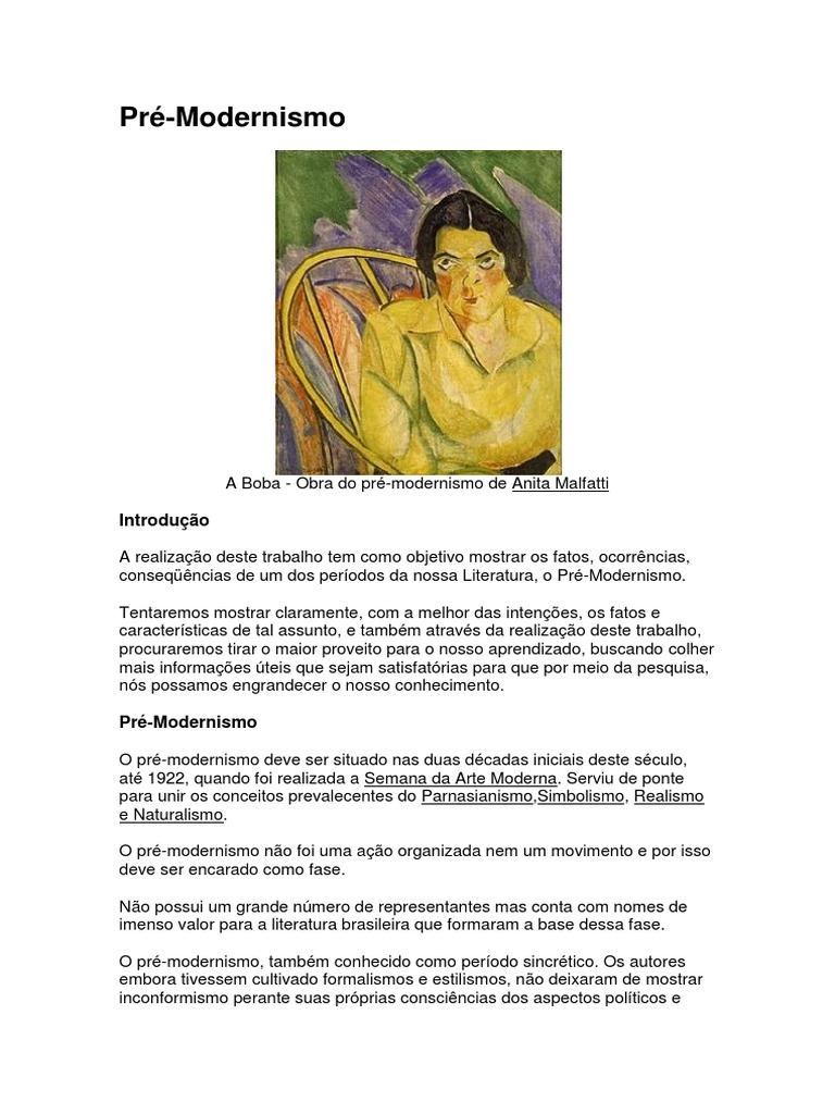 É importante ressaltar que o PréModernismo não é uma escola literária É um período de transição Marca o início do século XX, estendendose até 1922 Ocorre no período de ascensão da República, um período ainda conflituoso, repleto de manifestações populares etc Além disso, ao redor do mundo está acontecendo a 1ª guerra mundial. PREMODERNISMO ANTECEDENTES PRE MODERNISTAS Todos los pre modernistas son muy distintos pero hay algo que los caracteriza y es su resentimiento a las condiciones de vida social inmediata Todos fueron atraídos por un mundo de colores Los pintores representaban el munda tal y. O modernismo foi uma tendência artísticocultural ocorrida na primeira metade do século XX Se manifestou em diversos campos das artes, como a pintura, escultura, arquitetura, literatura, dança e música No Brasil, a linguagem de maior destaque dentro do movimento modernista.