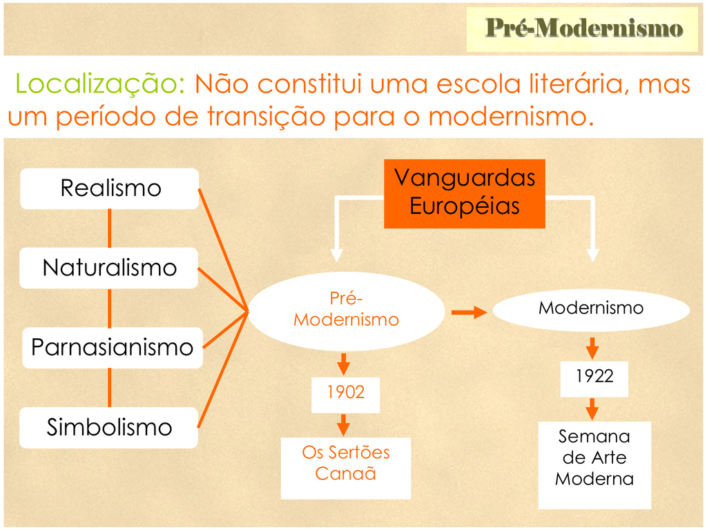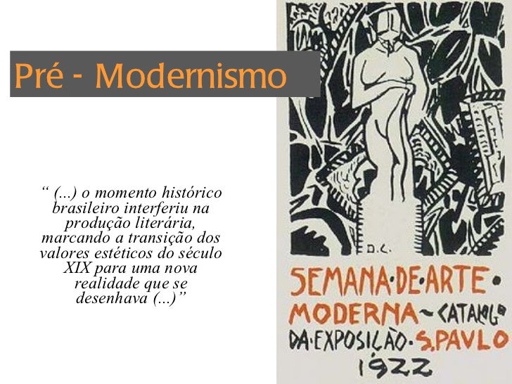 Prémodernismo é como ficou conhecido o período literário brasileiro que vai de 1902 até 1922 Na Europa, o período que antecedeu ao modernismo foi marcado pela tensão política entre os países imperialistas e pelo surgimento dos movimentos de vanguardaJá no Brasil, a Proclamação da República, o surgimento das favelas e a Guerra de Canudos são alguns fatos históricos que levaram. As principais características do PréModernismo são Denúncia dos problemas sociais enfrentados, como fome, miséria, abismos sociais, conflitos, entre outros;. O PréModernismo teve seu início em 1902, estabelecendo como limite as obras Os Sertões, de Euclides da Cunha, e Canaã, de Graça AranhaTerminou em 1922, com a Semana de Arte Moderna O movimento representou o momento de transição e de preparação para a fase de emancipação da literatura brasileira, o Modernismo.