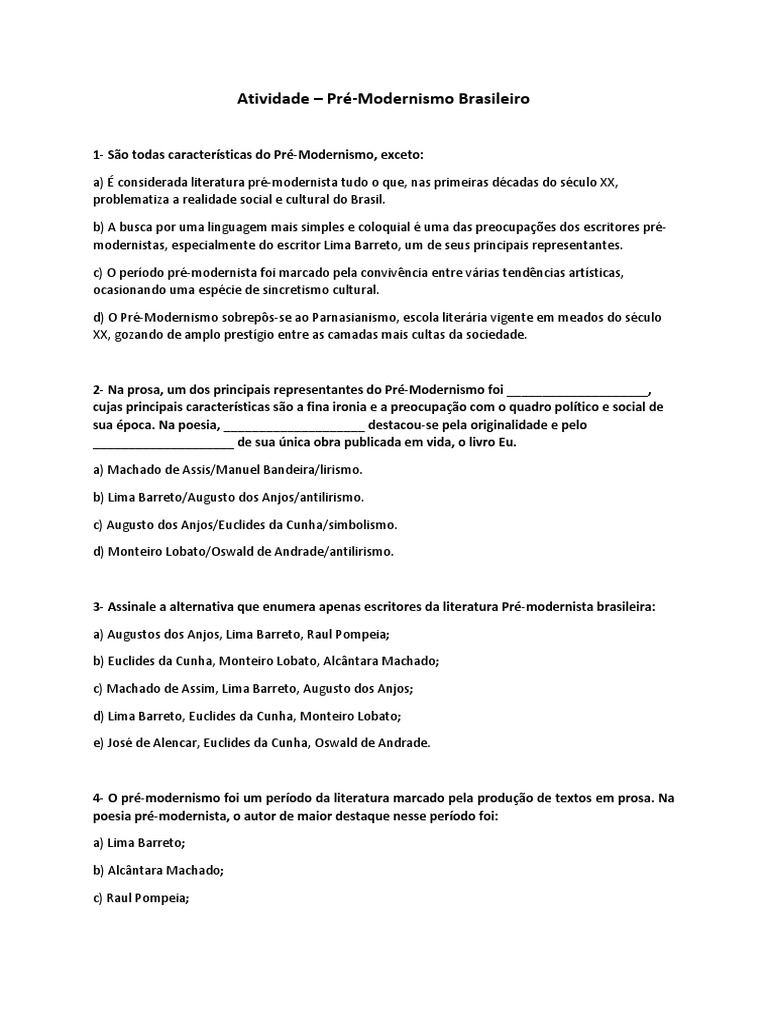 Faca Os Exercicios Sobre Pre Modernismo Com Gabarito
