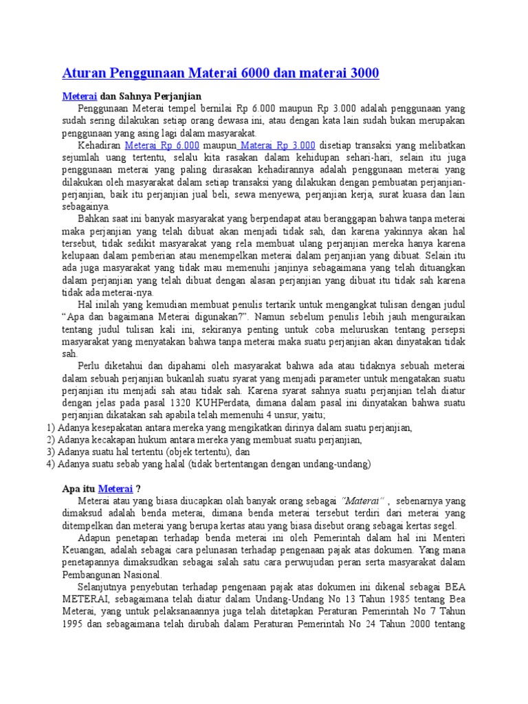 Kehadiran Meterai Rp 6000 maupun Materai Rp 3000 disetiap transaksi yang melibatkan sejumlah uang tertentu, selalu kita rasakan dalam kehidupan seharihari, selain itu juga penggunaan meterai yang paling dirasakan kehadirannya adalah penggunaan meterai yang dilakukan oleh masyarakat dalam setiap transaksi yang dilakukan dengan pembuatan perjanjianperjanjian, baik itu perjanjian jual beli. Perlu untuk kita ketahui, 1 Januari 21 Pemerintah Indonesia secara resmi mengumumkan penggunaan dan penerapan materai. Umpama apakah di dlm TTd kita sbg pertama?.