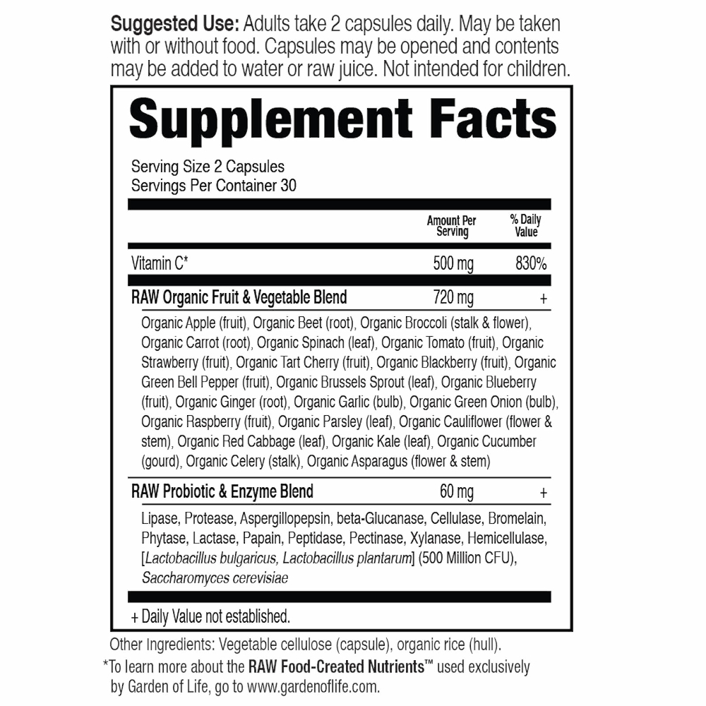 Serving Size 2 Capsules Servings Per Container 60 Amount Per Serving / % DV Vitamin C 500mg / 0% RAW Organic Fruit & Vegetable Blend 7mg / † Organic apple (fruit)‚ organic beet (root)‚ organic broccoli (stalk & flower)‚ organic carrot (root)‚ organic spinach (leaf)‚ organic tomato (fruit)‚ organic strawberry (fruit)‚ organic tart cherry (fruit)‚ organic blackberry. Buy Garden of Life Vitamin Code Raw Prenatal Multivitamin, Whole Food Prenatal Vitamins with Iron, Folate not Folic Acid, Probiotics, Best Vegetarian NonGMO Gluten Free Prenatals for Women, 180 Capsules on Amazoncom FREE SHIPPING on qualified orders. Serving Size 2 Capsules Servings Per Container 60 Amount Per Serving / % DV Vitamin C 500mg / 0% RAW Organic Fruit & Vegetable Blend 7mg / † Organic apple (fruit)‚ organic beet (root)‚ organic broccoli (stalk & flower)‚ organic carrot (root)‚ organic spinach (leaf)‚ organic tomato (fruit)‚ organic strawberry (fruit)‚ organic tart cherry (fruit)‚ organic blackberry.