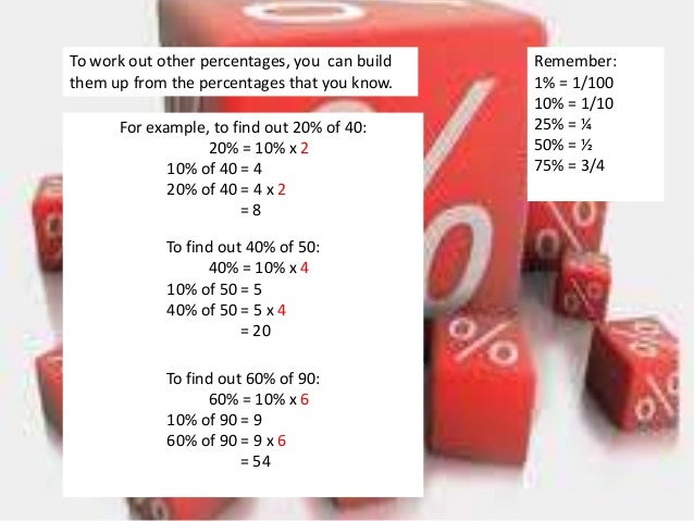 % / 100 = 45 / 60 Cross multiply % x 60 = 45 x 100 Divide by 60 to get the percentage % = (45 x 100) / 60 = 75% A shorter way to calculate x out of y You can easily find 45 is out of 60, in one step, by simply dividing 45 by 60, then multiplying the result by 100 So, 45 is out of 60 = 45 / 60 x 100 = 75%. Add or deduct 15% to/from ;. $12 is divided by % $12 / % = ($12 / ) × 100 = $60 Percentage change calculation What is the percentage change from $40 to $50?.