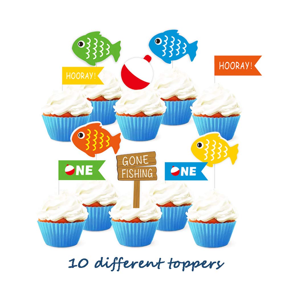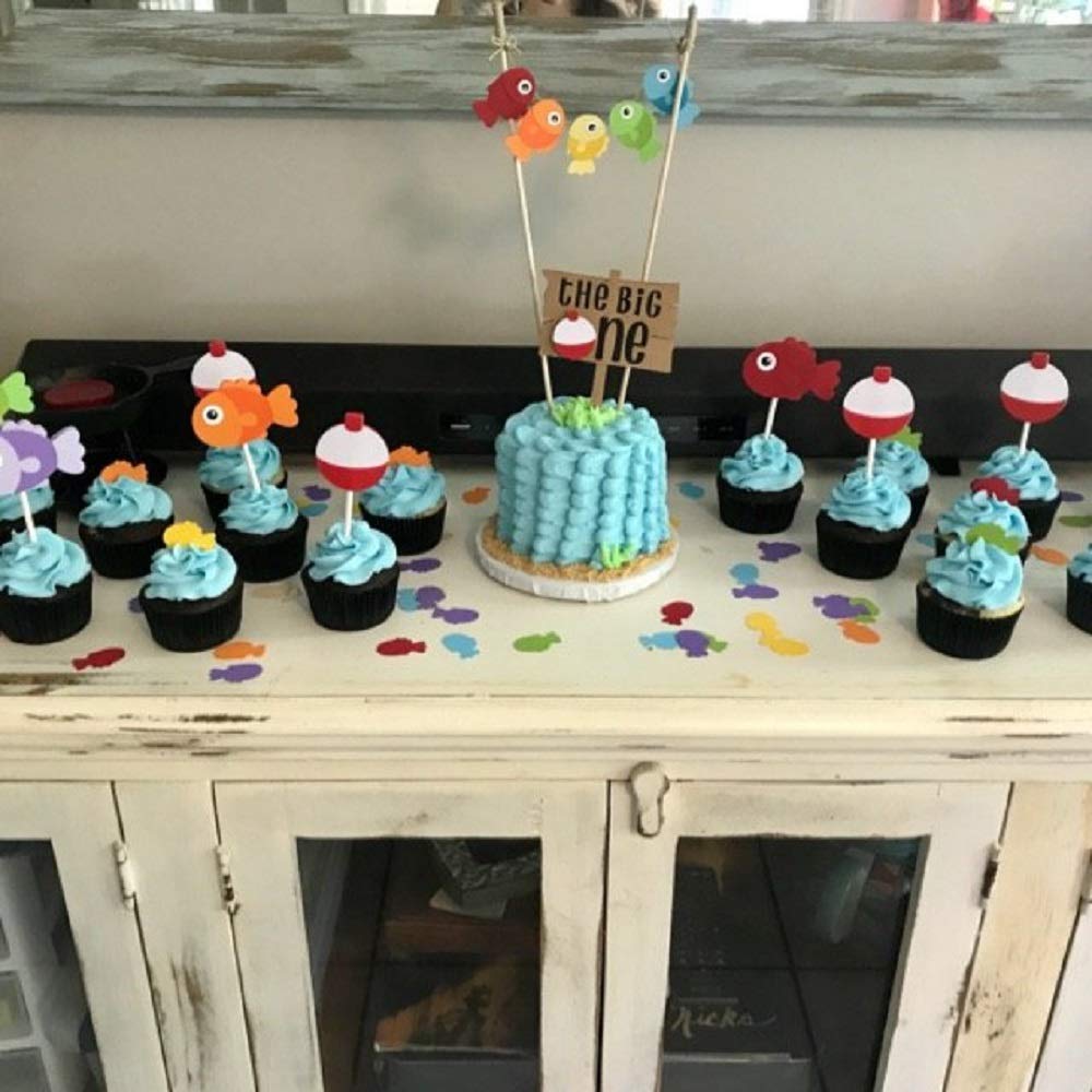 The fishing/beach theme is a really good one!. This awesome FISH THEMED FIRST BIRTHDAY PARTY was submitted by Kim Ermer What a darling theme for a first birthday party There are so many elements that I just adore, but I especially love the cute and simple birthday cake with little goldfish on the side There are so many fun ideas that you could use for a fish, goldfish, fishing, or nautical themed party. 🐟Fishing Bobber Cupcake Topper Package includes 30 pcs fishing party cupcake toppers as the picture shown 🌊Little Fisherman Cake Decorations size as as the picture shown 🐳 our top priority is customer satisfaction, so your purchase comes with a moneyback.