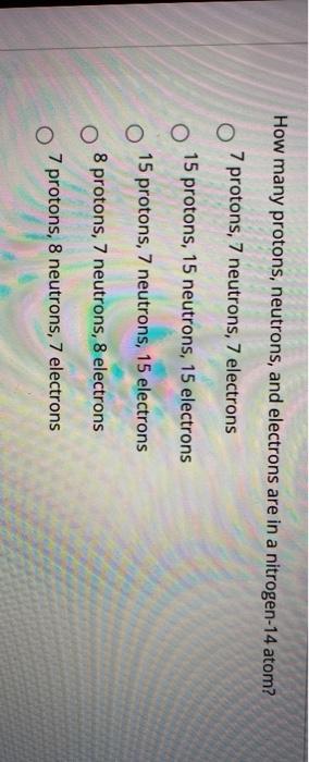 N14 > 14 minus 7 = 7 and N15 > 15 7 = 8 Notice that 7 is the atomic number of nitrogen and I used it in both subtractions nmber of electrons you have to know the charge on the atom. 7 protons 7 neutrons 10 electrons element February 19, 21 by Comments are off. The number of protons is unique for each element, so Nitrogen will always have 7 protons There is usually the same number of electrons as there are protons, so that would be 7 too (unless there is.