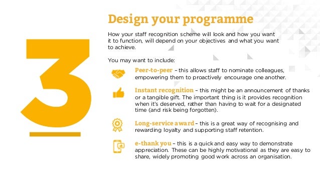 Encourage peertopeer recognition Recognition from colleagues is just as important as being recognized by leadership Peertopeer recognition builds employee engagement and helps establish a positive company culture In fact, research shows that peertopeer recognition can boost employee performance by as much as 14 percent. Ideally, you shouldn’t announce the employee recognition program in an email or on your website Instead, you should explain it at a team meeting If you have a very large company with multiple offices, consider traveling around to the different offices to talk about the program. PeertoPeer Recognition Welcome to company name’s staff recognition programme – “Appreciate, Celebrate & Congratulate” The goal of this webbased program is to enable you to provide instantaneous and personal recognition when one or more of your coworkers goes above and beyond in their job duties “Appreciate, Celebrate & Congratulate” is a fun way to provide visibility for successes, identify rising stars, encourage positive personal interaction and communication, and.