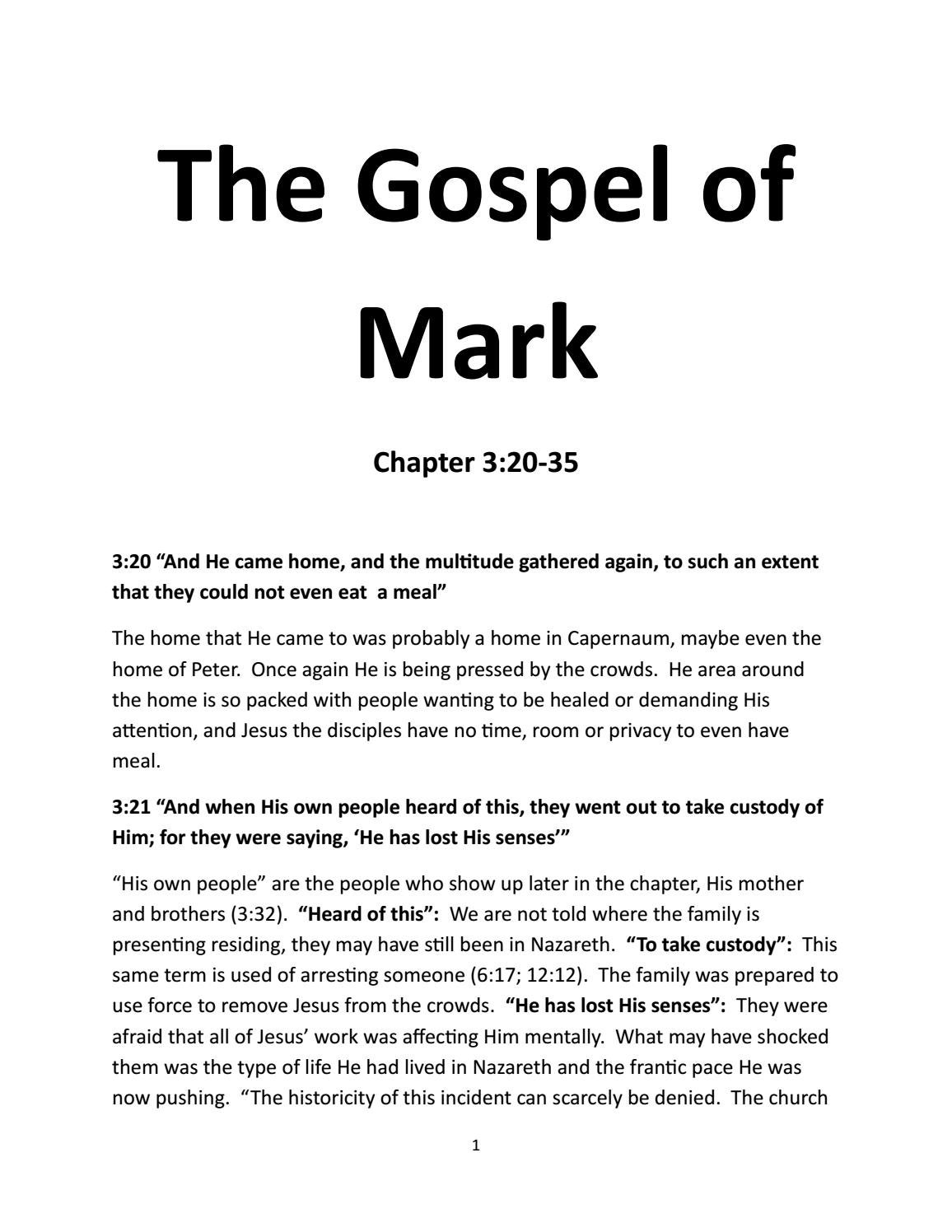 Mark 335 (NASB) And He came home, and the crowd gathered again, to such an extent that they could not even eat a meal 21 When His own people heard of this, they went out to take custody of Him;. Commentary on Mark 335 View Bible Text Jesus did not fit in He was at odds with his family’s sociological script and with the religious authorities Even among his closest companions, as we have just read in 319, there is one who will betray him But undergirding all of that resistance from the beginning, he was at odds with Satan. Mark 335 “God’s Family”We livestreamed our service at 9am this Sunday morning We hope you enjoy this week's worship service Please share this video.