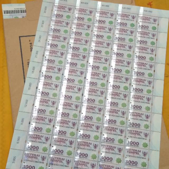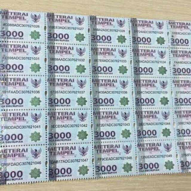 Ilustrasi Materai 3000 dan 6000 Share VIVA – Direktorat Jenderal Pajak Kementerian Keuangan tengah menyiapkan meterai tempel dengan nominal Rp Bea meterai tarif tunggal tersebut berlaku sejak 1 Januari 21 sesuai dengan UndangUndang (UU) Nomor 10 Tahun tentang Bea Meterai. TRIBUNNEWSWIKICOM Materai baru Rp resmi berlaku per 1 Januari 21, untuk menggantikan nominal Rp 3000 dan Rp 6000 Pergantian bea materai baru tersebut tertuang dalam UU Nomor 10 Tahun tentang Bea Materai Meski sudah resmi diberlakukan, namun materai Rp belum mencapai tahap distribusi. Jenis materai kertas yang beredar selama ini adalah materai 3000 dan materai 6000 Namun penggunaan materai tidak boleh asal tempel Karena penggunaannya diatur dalam UndangUndang Nomor 13 Tahun 1985 tentang Bea Materai Kala itu, tarif bea meterai sebesar Rp500 dan Rp1000.