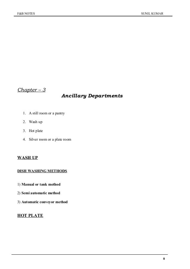 Without the help of the ancillary departments F&B service department cannot work smoothly In this regard the ancillary departments are very important for F&B service department Major ancillary departments in a five star hotel are the following 1 Pantry 2 Still room 3 Silver room 4 Linen Room 5 Hot plate 6 Washup area 7. The F&B services are bound to provide safetoeat food that is prepared by following hygiene and sanitation practices Importance of Hygiene in F&B Service F&B services have direct access to guests’ health through food and beverages The working staff handles every food and drink item closely that the guest is going to eat. Room rent is XXX per night which included complimentary breakfast and Transfers or You also pay in advanced for transportation service Your confirmation number is XXX” Guest Yes, you are right.