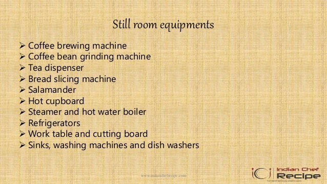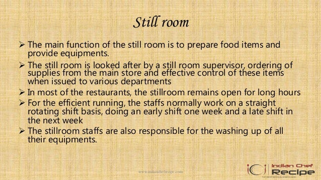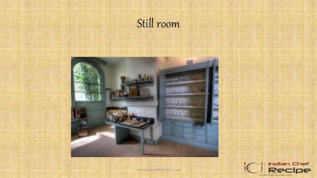 Ladies served first At a large formal dinner, or one where strict protocol is followed, service may commence with the women, starting with the lady of honor Although this is a courteous method of service, it is slow, as each butler must circle the table numerous times and crisscross around the room Service in the order of progression. Still room, plate room, pantry room in hotel 1 Still room, plate room, pantry room 1wwwindianchefrecipecom 2 Still room The main function of the still room is to prepare food items and provide equipments The still room is looked after by a still room supervisor, ordering of supplies from the main store and effective control of these items when issued to various departments In most of the. From Wikipedia The still room is a distillery room found in most great houses, castles or large establishments throughout Europe dating back at least to medieval times The lady of the house was in charge of the room, where medicines were prepared, cosmetics and many home cleaning products created, and homebrewed beer or wine was often made.