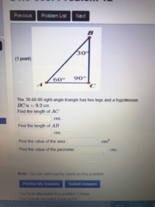 Although all right triangles have special features – trigonometric functions and the Pythagorean theoremThe most frequently studied right triangles, the special right triangles, are the 30, 60, 90 Triangles followed by the 45, 45, 90 triangles. Question 30 (1 Point) The Rightangle Triangle Has Two Legs And A Hypotenuse Find The Length Of AC Find The Length Of AB Cm Cm Cm Find The Value Of The Area Cm Find The Value Of The Perimeter Cm This problem has been solved!. The 30 – 60 – 90 degree triangle is in the shape of half an equilateral triangle, cut straight down the middle along its altitude It has angles of 30°, 60°, and 90° and sides in the ratio of The following figure shows an example Get acquainted with this triangle by doing a couple of.