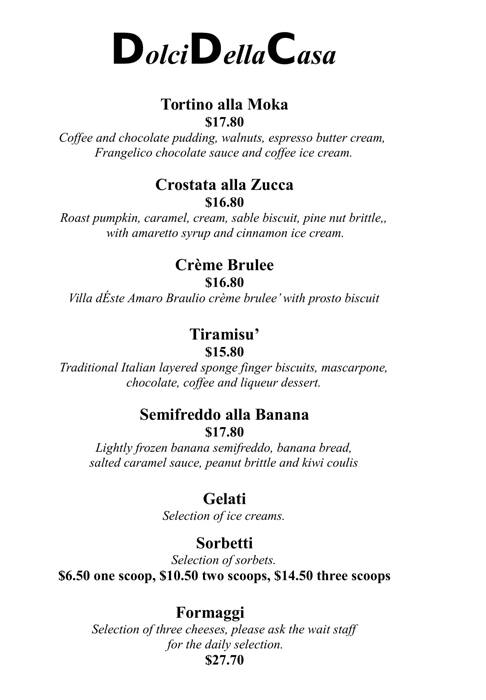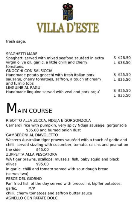 Villa D Este Restaurant Menu Menu For Villa D Este Restaurant West Perth Perth