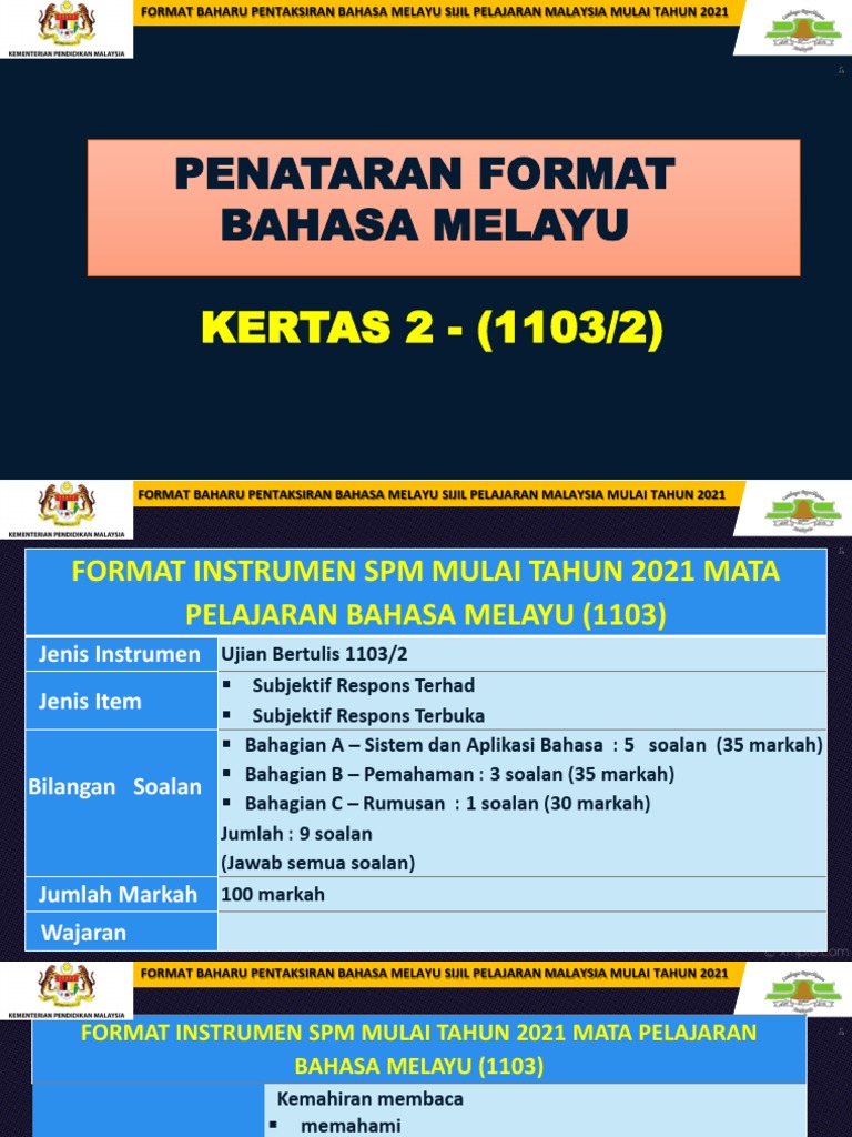 Format Pentaksiran Bahasa Melayu Spm Mulai 21 papar berkaitan pada 6/9/ jumlah 2 hits Format baharu instrumen soalan subjek Bahasa Melayu bagi peperiksaan SPM mulai 21 Lembaga Peperiksaan Kementerian Pendidikan Malaysia telah mengumumkan format baharu pentaksiran Sijil Pelajaran Malaysia mulai tahun 21 bagi mata pelajara. Lembaga Peperiksaan, Kementerian Pendidikan Malaysia telah menyediakan format pentaksiran bagi mata pelajaran Bahasa Melayu SPM mulai tahun 21 Format tersebut telah dibentangkan dan dipersetujui dalam Mesyuarat Jawatankuasa Kurikulum Kebangsaan, Kementerian Pendidikan Malaysia, Bil 1/ pada 21 Februari. FORMAT PENTAKSIRAN BAHASA MELAYU 12 92 FORMAT INSTRUMEN PEPERIKSAAN SPM MULAI TAHUN 21 MATA PELAJARAN BAHASA MELAYU (1103) Bil Perkara Kertas 1 (1103/1) Kertas 2 (1103/2) Kertas 3 (1103/3) Kertas 4 (1103/4) 1 Jenis Instrumen UjianBertulis Bertutur Mendengar 2 Jenis Item Subjektif Respons Terhad Subjektif Respons Terbuka Subjektif.