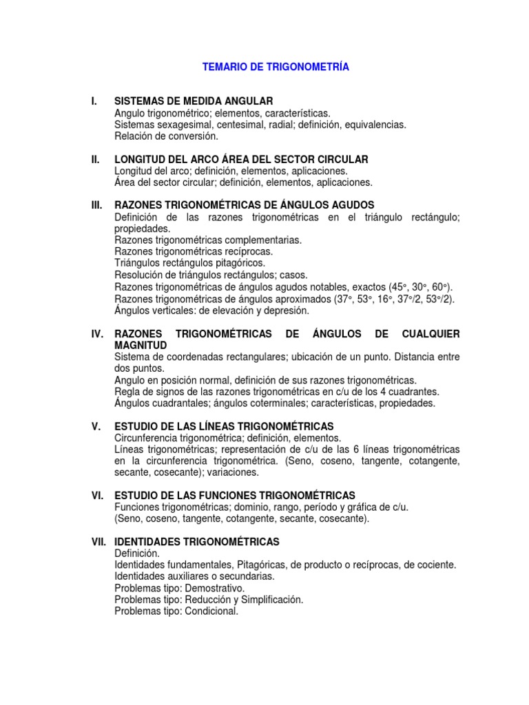Temario De Trigonometria Funciones Especiales Trigonometria