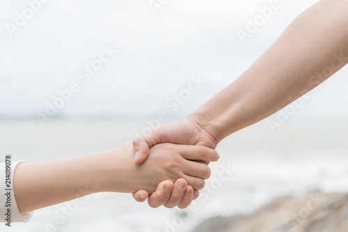 Symbols Of Love Couple Of Man And Woman Hand Holding Together On Blurred Sea And Sky Background For Love And Valentines Day And Friendship Day Concept Buy This Stock Photo And