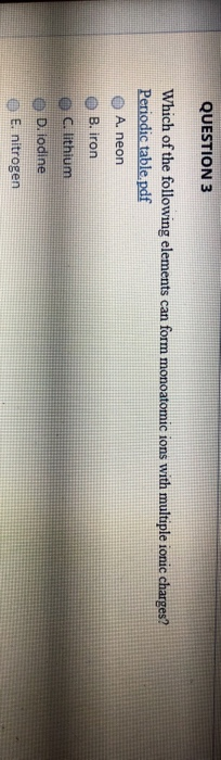 Periodic Tablepdf A Iodine B Iron C Nitrogen D Neon O E Lithium This question hasn't been answered yet Ask an expert Show transcribed image text Expert Answer. Question QUESTION 18 Which Of The Following Elements Can Form Monoatomic Ions With Multiple Ionic Charges?. PERIODIC TABLE OF ELEMENTS Title Ptablecom Periodic Table Author Michael Dayah Created Date 2/6/17 1235 AM.