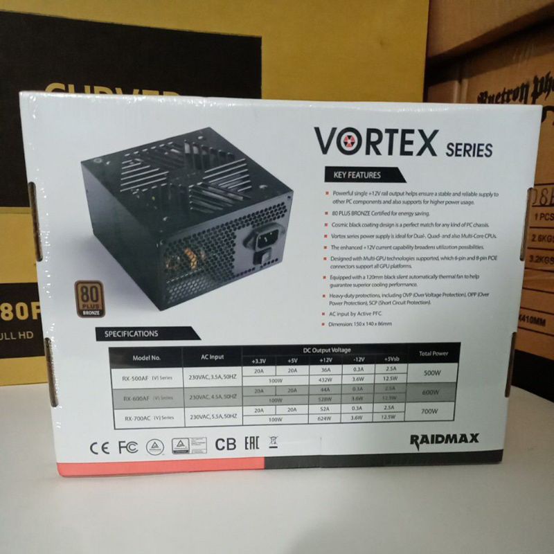 RX500AFV Raidmax Vortex 500W 80 Plus Bronze NonModular PSU is available from Laptop Direct and it is sold as new from our Power supply unit range of products For reference purposes, the price of R652 is valid 2102, and while stocks last, may be valid until , but this is a guide only Prices may change without prior notice. Product Title RAIDMAX Vortex 735W ATX 12V v23 / EPS 12V SLI Ready Crossfire Ready 80 Plus Bronze Certified SemiModular Power Supply (735W) Average Rating ( 00 ) out of 5 stars Current Price $5999 $ 59 99. Power up your rig with the powerful and stable Raidmax Vortex 700W 80 PLUS Bronze NonModular PSU It utilises a single 12V rail output for enhanced stability and further possibilities This power supply is designed with heavyduty protective technologies, namely Over Voltage Protection (OVP), Over Power Protection (OPP) and Short Circuit.