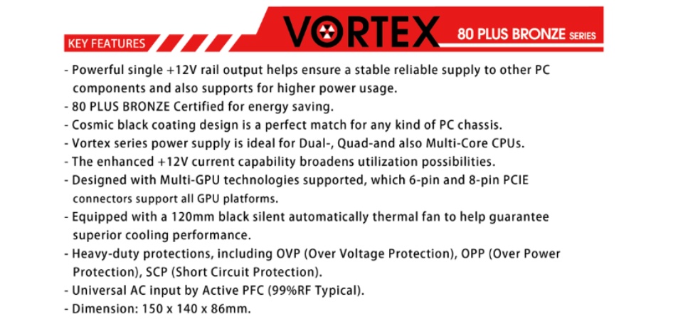 Description Power up your rig with the powerful and stable Raidmax Vortex 500W 80 PLUS Bronze NonModular PSU It utilises a single 12V rail output for enhanced stability and further possibilities.