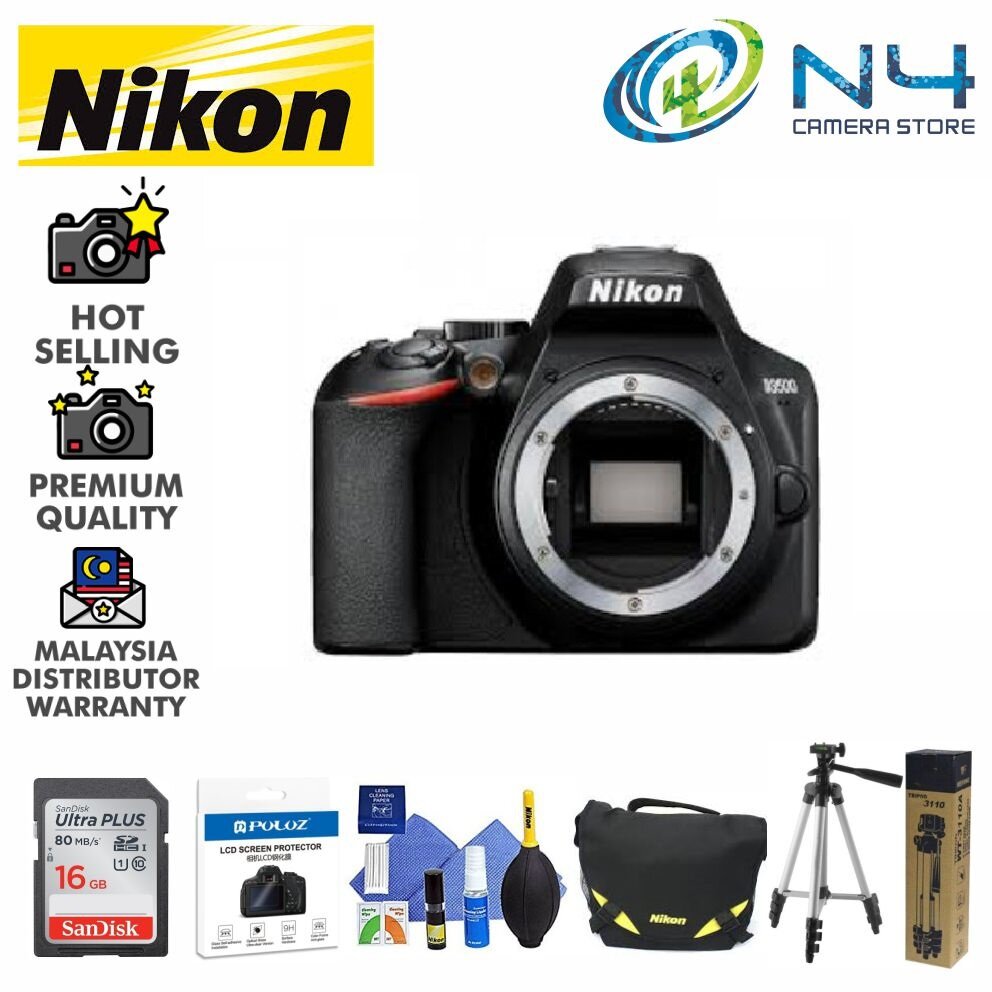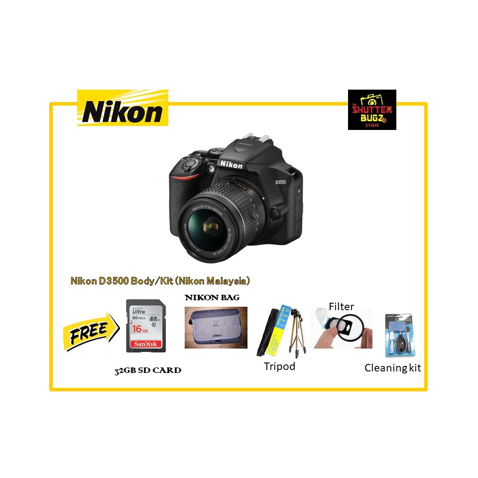 Download Nikon's free SnapBridge app and your D3500 photos will appear right on a compatible smartphone or tablet* for posting to your favorite sites, sharing with friends and family or just as backups You can even use the smartphone or tablet to remotely trigger the D3500 to take pictures. Combining outstanding optics with sophisticated design and features, Nikon compact digital cameras capture your everyday precious moments Film SLR Cameras Since 1948, our film cameras have been loved by photographers around the globe. Nikon D3500 DSLR Camera with 1855mm Lens 16GBBag (Import) newspeed Ship from Selangor ,Estimated Arrival 13 working days RM 2, 24 % RM1,900 RM 00 Add to wishlist (0) Nikon D3500 DSLR Camera with 1855mm Lens 16GBBag (MSIA) newspeed.