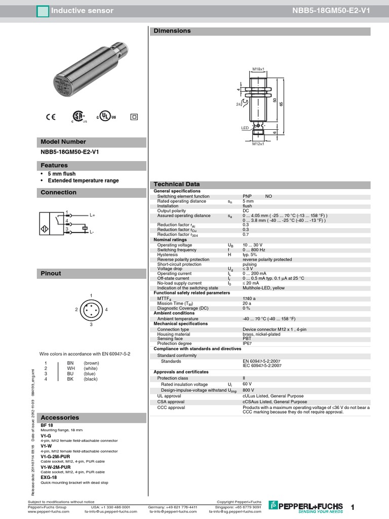 Buy NBB 212GM50E2V1 Pepperlfuchs INDUCTIVE PROXIMITY SENSORS element14 offers special pricing, same day dispatch, fast delivery, wide inventory, datasheets & technical support. Switching function Normally open (NO) Output type PNP Rated operating distance 2 mm Installation flush Output polarity DC Assured operating distance. Download the complete datasheet as a PDF Datasheet excerpt Technical data of NBB212GM50E2V1 General specifications;.