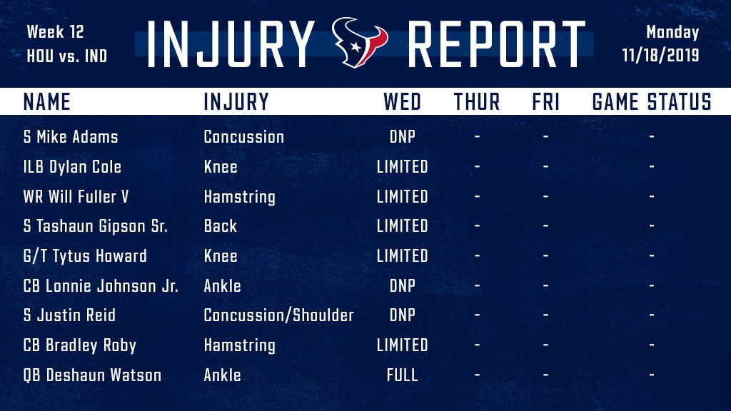 Texans Pr The Houston Texans Monday Injury Report For Week 12 Vs The Indianapolis Colts The Team Conducted A Walkthrough And The Injury Report Is Only An Estimation Of A