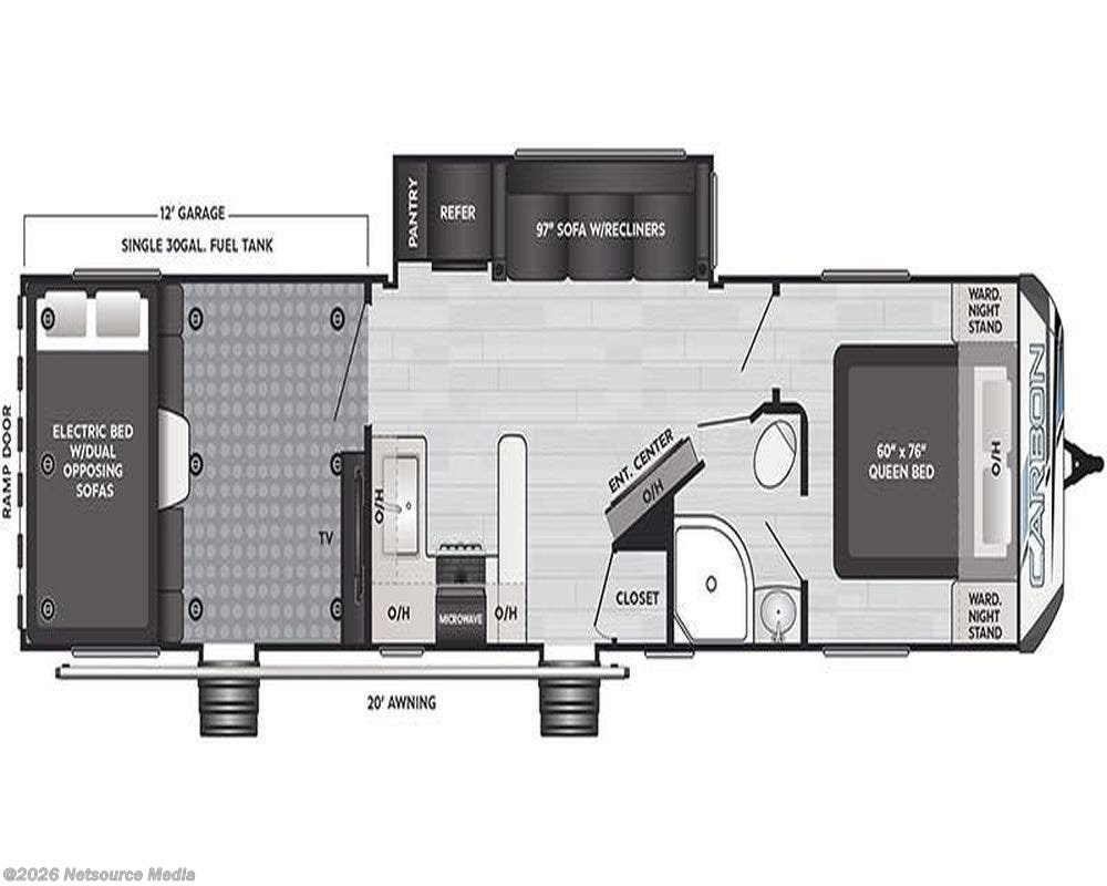 The Carbon 358 is a 38’ 11", triple slideout 5th wheel toy hauler trailer that has an 13’ 2" garage, and will sleep up to 7 people Options include INTERIOR DECOR QUANTUM INTERIOR CAMPING PACKAGE EXTERIOR CAMPING PACKAGE 6 POINT HYDRAULIC AUTO LEVELING PULL DOWN SCREEN IN CARGO AREA 2nd 3/4 TON HE A/C REFRIGERATOR RV 12cf.