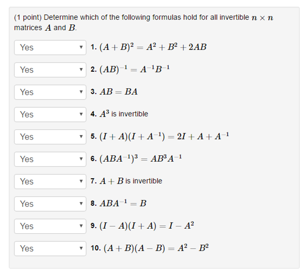 Inverse of a 2×2 Matrix In this lesson, we are only going to deal with 2×2 square matricesI have prepared five (5) worked examples to illustrate the procedure on how to solve or find the inverse matrix using the Formula Method Just to provide you with the general idea, two matrices are inverses of each other if their product is the identity matrix. Note The quadratic portion of each cube formula does not factor, so don't waste time attempting to factor it Yes, a 2 – 2ab b 2 and a 2 2ab b 2 factor, but that's because of the 2 's on their middle terms These sum and differenceofcubes formulas' quadratic terms do not have that "2", and thus cannot factor. The subtraction of b from a is written as a − b It is basically an algebraic expression and also a binomial The square of this expression is written as ( a − b) 2 in mathematical form and it is expanded as a 2 − 2 a b b 2 mathematically In mathematics, this algebraic identity is used as a formula and it is called in the following three ways.