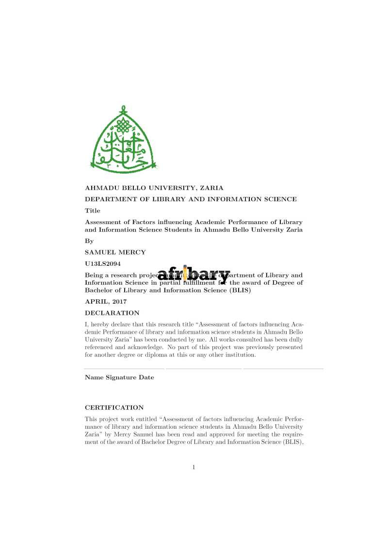 Assessment Of Factors Influencing Academic Performance Of Library And Information Science Students In Ahmadu Bello University Zaria Afribary